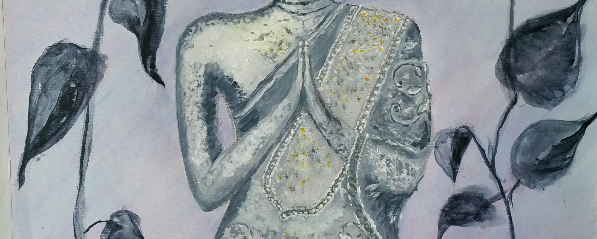 Painting of a statue of Buddha done in acrylics. Bodhi leaves are from a photo of shadows from the plants on my windowsill reflecting through the curtains. I chose Paynes Grey to compliment the purple and the statue. There are shades of yellow on the statue and the background has some hint of purple and pink. I used a mixture of brushes. For the leaves I used a sword brush, then a small round, a chiseled wedge and a large flat brush to do the wash.
