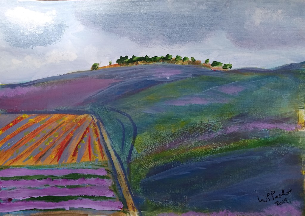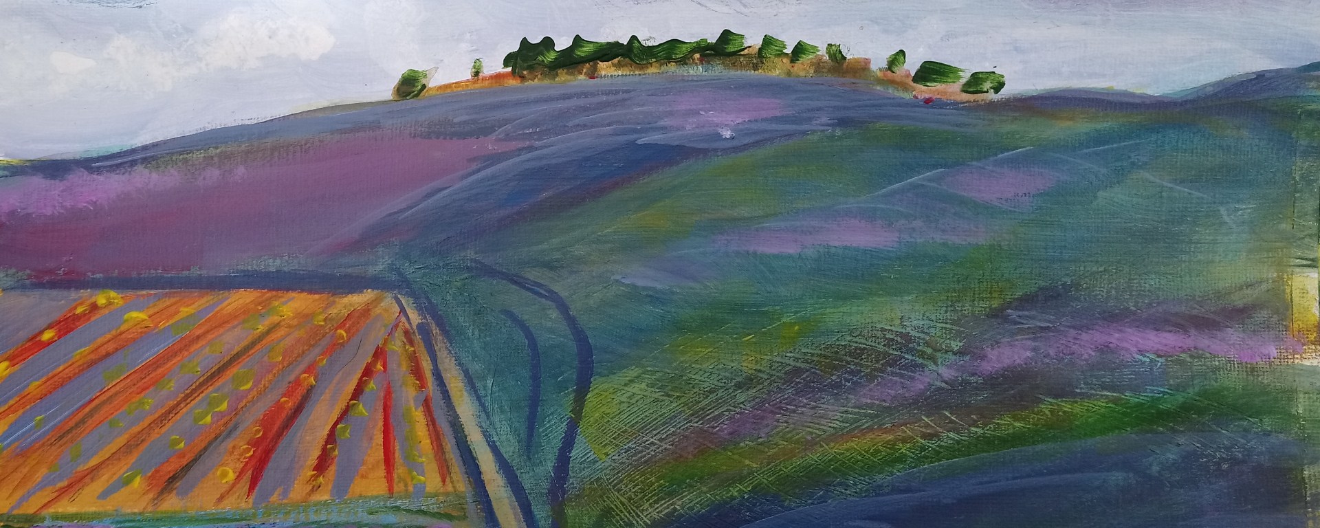 This started off with a very yellow and green landscape which I decided to change to warmer colours of purples and pinks with a touch of Van Gogh. It was originally intended to be in the style of Eric Ravilious but didn’t quite capture the essence of the technique so I did my own version.