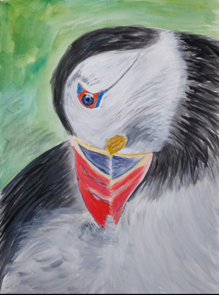 I wasn’t quite sure how to do this so I started with what I thought was probably the most important feature – its eye, then the beak. From then on I used strokes to try and create the feel of feathers. I think it worked anyway. I was pleased with the result and that’s the main thing. It was fun to do. By the way, I love puffins.