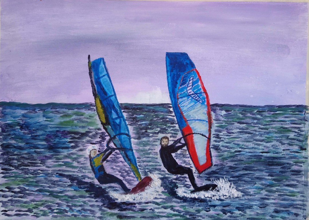 This was an attempt at painting my daughter and her partner in Auckland. They love windsurfing and she had sent me some pictures to paint. It was an interesting painting to try as I had to paint lots of different colour strokes in order to get the right effect of waves. I actually used two different pictures as my subject and joined them together in the painting. They weren’t side by side in the original photo so I thought it might be fun to try and create my own version with them together.