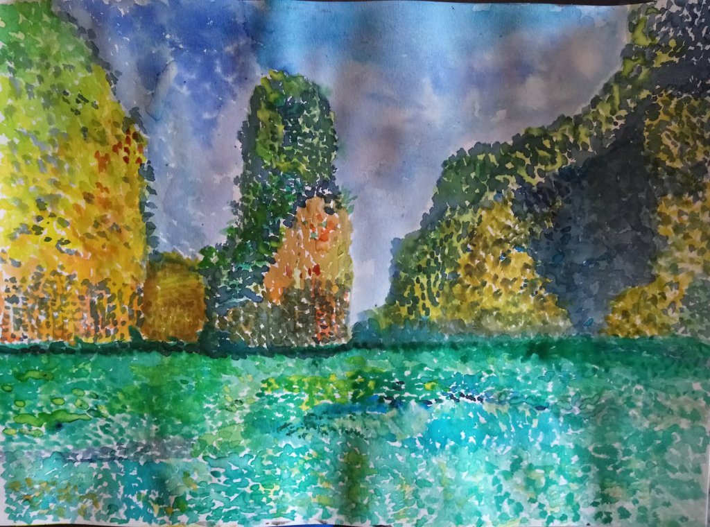 My Three daughters visited Phuket in Thailand just after the Coronvirus outbreak began to hit Asia. Luckily for them they managed to enjoy their holiday and return unscathed before the lockdown. This interesting place was ideal to try some Pointilism in inks and Brusho. What great fun.