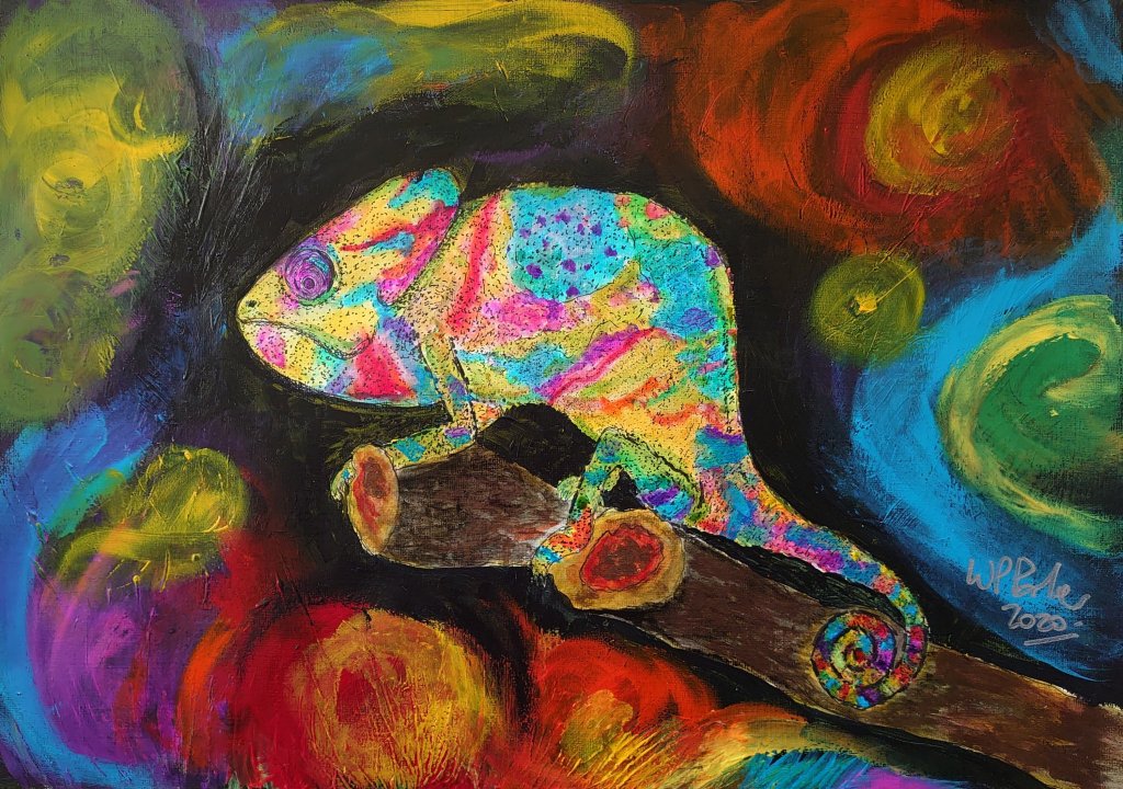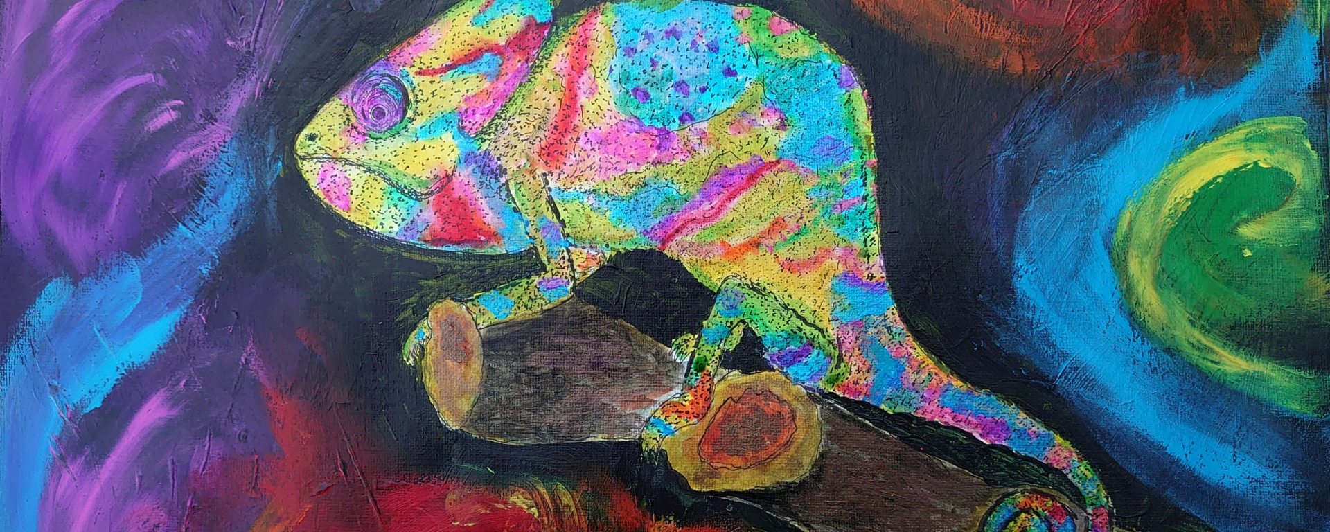 My sister in law sent me a picture of a Rainbow Chameleon one day when we were feeling pretty stressed out from my brother being ill. She knew I enjoyed using a lot of colour and gave me the opportunity to have a try and doing a painting. This wasn’t the original picture so I got another one from a website and tried different media to get the effect I wanted. I’m not sure about the background. Originally it was plain but my husband said it needed something so I added the plants and grasses. I think it is a bit too much and maybe I will paint it out eventually. Since I last edited I have changed the background by painting it in Payne’s Gray and then adding the same rainbow colours in a cosmic fog.