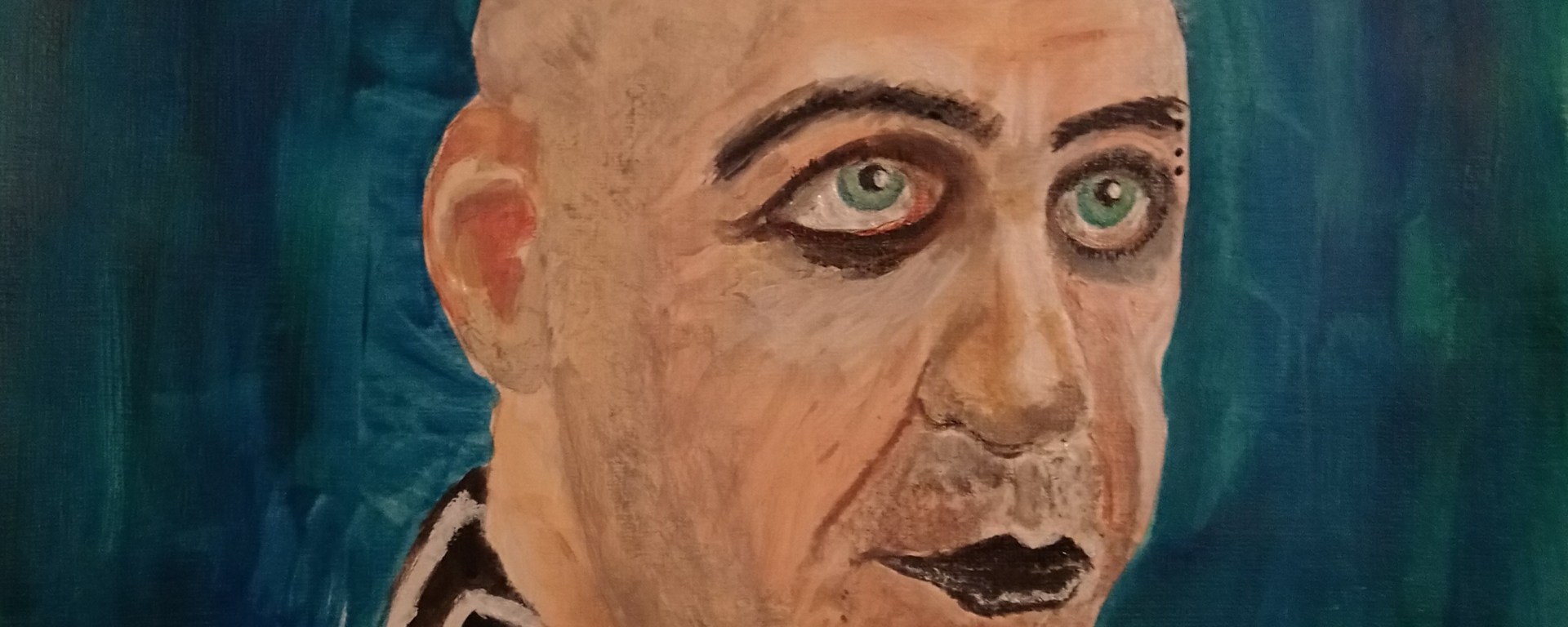 I’m not comfortable with the result of this painting and just can’t help finding fault with it. Every time I look I see another mistake. Trouble is I can’t really be bothered to change it now. It was just a practice run in painting portraits. Being self critical I find it rather crude and a bit juvenile but then maybe that’s its appeal. I did this in acrylic.