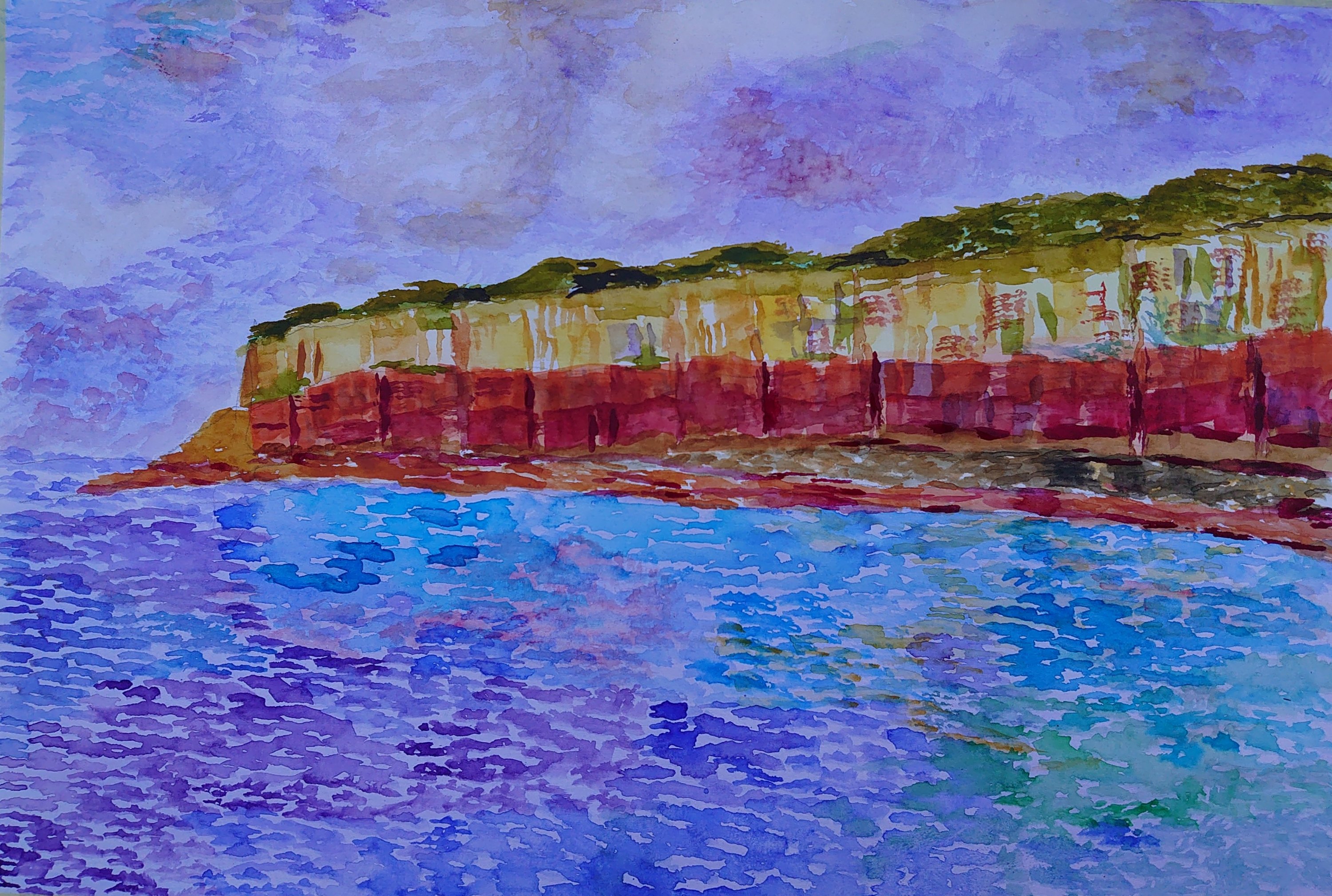 The second of two paintings in watercolour of Hunstanton Cliffs this time using a different technique. I used a 10mm angular flat brush to create the rippling effect of the sea. I used the same technique for the cliffs but vertical patterns as well as horizontal. I used yellow ochre, vermillion, dark crimson, violet, ultramarine, dark green, raw umber and yellow.