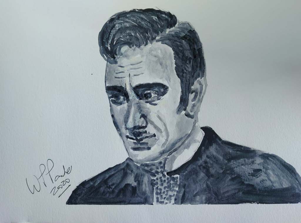 As it stands this painting is a reasonable effort of Soames but I am not fully satisfied that it even begins to resemble the actor Eric Porter who portrayed him in the Forsyte Saga. Done in watercolour Payne’s Gray on mixed media paper.