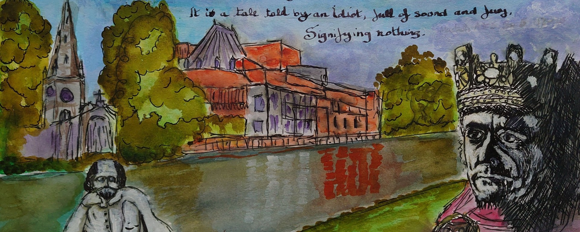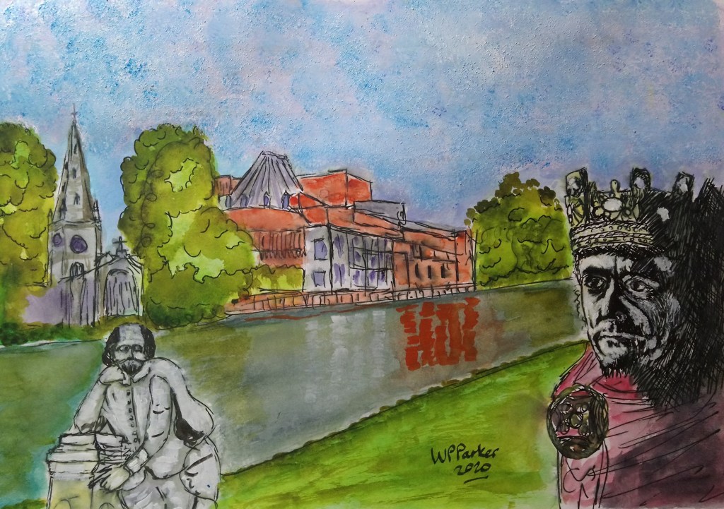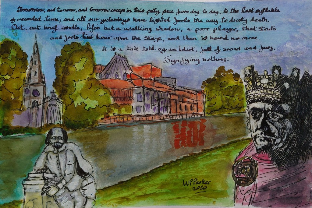 Okay so I have had a bad attack of perfectionist syndrome here. (above) It was never going to work out as I really hoped. Having said that I think I achieved what I needed to and that was a narrative about Stratford on Avon, Will Shakespeare and Eric Porter not to mention Macbeth. I decided to add the famous soliloquy after the death of Lady Macbeth as spoken by Macbeth. It is a very powerful piece and one that I have always remembered for its significant symbolism. The painting of Eric Porter on the right hand side has a dark shadow, on purpose…. to signify the darker side of this tragedy. Whilst on the left we have the Bard leaning casually on a plinth surveying his surroundings. In the background we have to the left the Holy Trinity Church where Shakespeare is buried and the Royal Shakespeare Theatre which both overlook the river Avon. Above is a rather crude attempt at writing the soliloquy – hence perfectionist syndrome. It will forever stick out like a sore thumb but hey this is just a practice….. calligraphy is definitely not my forte….. (below)