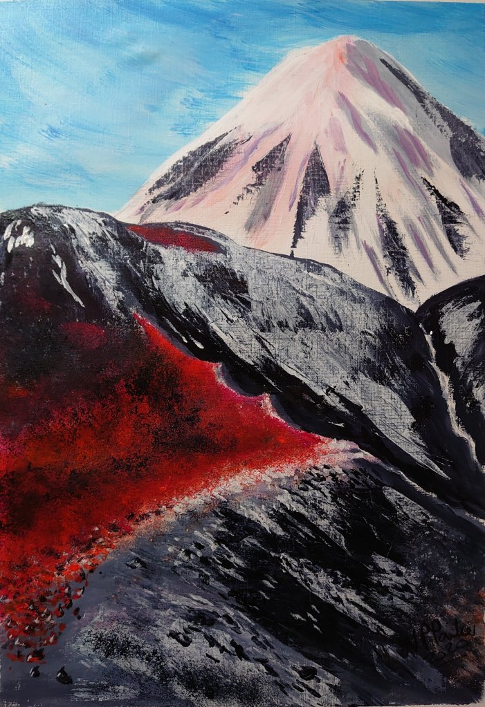 Using acrylics on a mixed media paper with Payne’s Gray, Titanium White, Alazarin Crimson, Vermillion, Lemon Yellow and Cerulean Blue with credit card technique angled brushes sizes 6-10 and sponges.